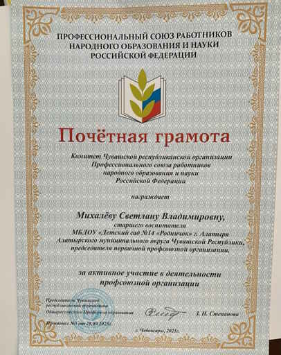 Председатель первичной профсоюзной организации нашего детского сада Михалева Светлана Владимировна была награждена Почётной грамотой за вклад в укрепление организационного единства, сохранение профсоюзного членства, эффективную защиту трудовых прав и социально-экономических интересов членов Профсоюза.
